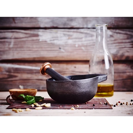 Fabriqué en fonte robuste, les caractéristiques de ce matériau font du mortier avec pilon, un accessoire performant à la longévité exceptionnelle. Il présente une finition rugueuse facilitant le broyage des épices ; aromates, herbes fraiches, graines, baies, fruits à coque, sont écrasés en un rien de temps. Bien pensé, sa forme avec un bord légèrement incliné et sa poignée offre une parfaite prise en main pour atteindre très vite le résultat escompté tandis que son poids assez lourd lui garantit une bonne stabilité sur le plan de travail.