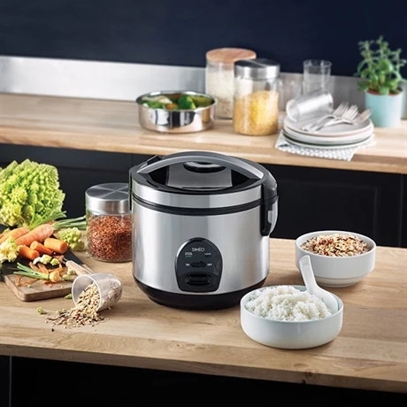 Pour une cuisine qui reste propre, l’eau de condensation est récoltée dans un collecteur amovible et votre couvercle est articulé. Par conséquent votre plan de travail est protégé des salissures. Pour un riz moelleux à souhait, une valve à vapeur amovible régule la quantité de vapeur et garanti un riz moelleux. Démontable, le nettoyage est facilité et un bouton central On/Off vous assure une utilisation en toute sécurité, notamment sans risque de mise en route intempestive.