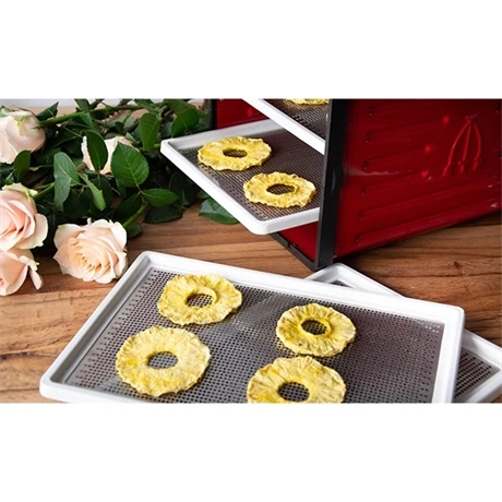 Robuste, ce déshydrateur est fabriqué en acier verni et nylon renforcé. Ses 6 plateaux vous octroi au total 5500 cm² pour conserver vos aliments que vous pourrez notamment gérer grâce aux programmes disponibles. Amplitude de chauffe de 20 à 68°C pour des aliments parfaitement déshydratés. Un livre pour vous apprendre à sécher les aliments est également inclus avec le déshydrateur Tacama.