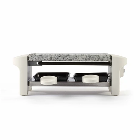L’appareil à raclette 2 personnes assure de passer de bons moments, en petit comité ! Cet appareil fera fondre votre fromage dans ses deux caquelons et vous pourrez faire griller de la viande ou des légumes sur le plateau supérieur en granite. L’appareil marche avec un simple bouton marche/arrêt. Doté de pieds antidérapants, vous le disposerez au centre de votre table en toute sécurité, il ne glissera pas !