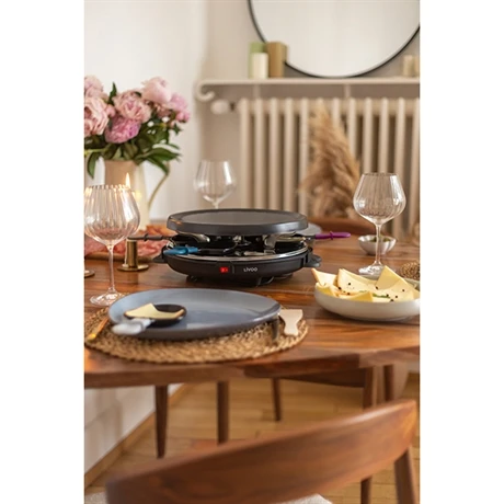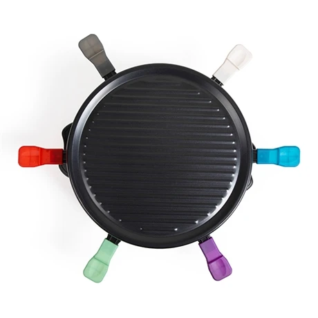L’appareil à raclette 6 personnes DOC207 est doté d’une puissance de 800 W ainsi que d’une forme circulaire conviviale et idéale pour les petites tables ! Pratique, votre raclette comporte un plateau grill amovible avec revêtement antiadhésif pour vous permettre de faire griller ou revenir vos aliments préférés en parallèle : bacon, petits légumes, poivrons, champignons, fruits de mer… vous pourrez accompagner votre raclette de délicieux aliments qui seront prêts en quelques minutes seulement. Simple à utiliser, votre appareil à raclette comporte seulement un interrupteur ON/OFF pour le mettre en marche et l’éteindre facilement. Son petit plus, 6 caquelons avec poignées en couleurs pour que chacun choisisse sa couleur préférée et le reconnaisse tout au long du repas ! Des poignées composées de jolies couleurs tendances : Gris clair, bleu canard, vert kaki, gris foncé, violet et orange pour satisfaire tous les goûts de vos convives.