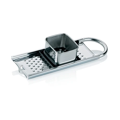Conçue en inox 18/10, cette mandoline est constituée de 2 parties indépendantes : la râpe qui dispose de perforations épaisses pour obtenir des spaetzles longs et le réservoir à pâte.