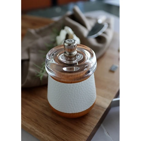 Fabriqué en bois de hêtre agrémenté d’un effet cuir grainé blanc, ce moulin est équipé d’un ressort pour que la mouture obtenue soit constante.