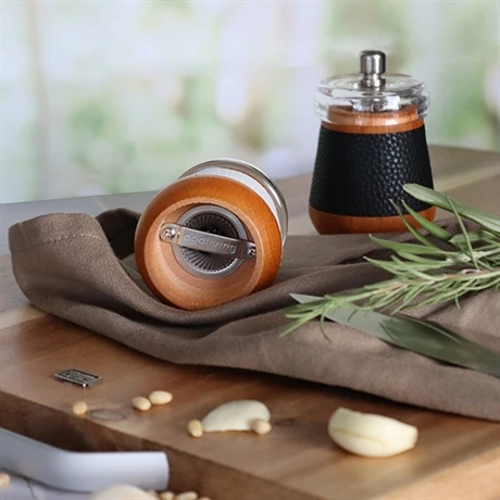 La version poivrière est identique avec le cuir grainé noir. Ce duo de mini moulins Ogo sera du plus grand effet sur votre table.