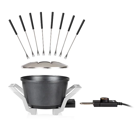 L’appareil à fondue de 800 W a une capacité d’1,5 L et convient idéalement pour 8 personnes. La cuve en fonte d’aluminium noire mate est robuste et a un revêtement antiadhésif. Avec son thermostat réglable, elle s’utilise pour vos fondues bourguignonnes, savoyardes mais aussi pour faire fondre du chocolat.
