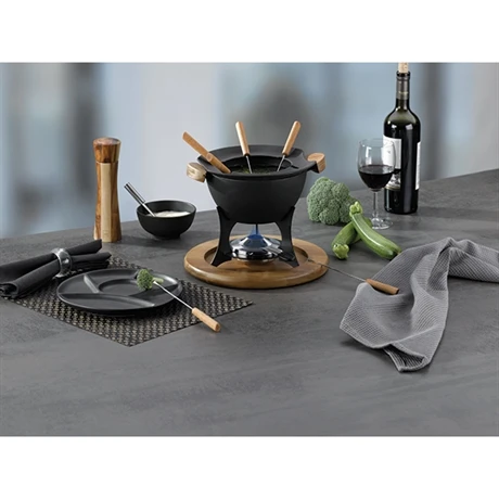 Muni d’un caquelon en fonte de fer émaillé avec des touches de bois d’acacia, cet ensemble possède un socle en bois, un brûleur en inox et 6 piques pour le pain ou les légumes.